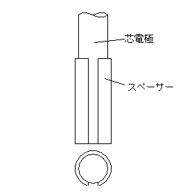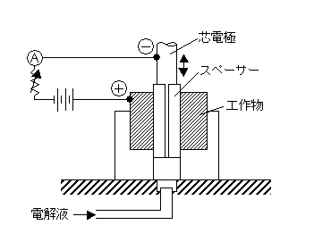 平面の場合には、電解液流中に溶出した電解生成物を流れにより除去する方法をとるが、小径穴の場合には、これに機械的な擦過作用を付加して工作物表面に存在する軟質固体状態の生成物を除去する。この際、凸部の電解反応が選択的に促進されて凹部との加工速度の差が増大することにより表面粗さの改善が進む。図の場合には、工具電極表面に巻かれたスペーサーがこの擦過作用をおこなう。