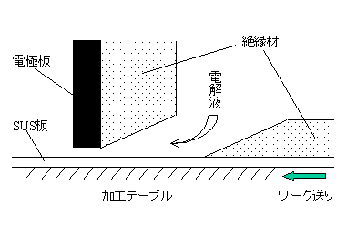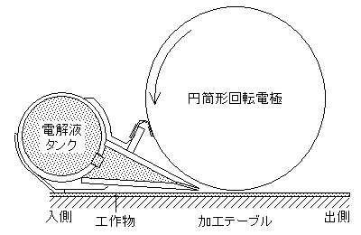 一般平面 工具電極と工作物を平行に保ち、いずれか一方を等速運動させながら高電流密度の電解加工を行うことにより、工作物の全表面を数μm~数10μmほど除去する加工法である。