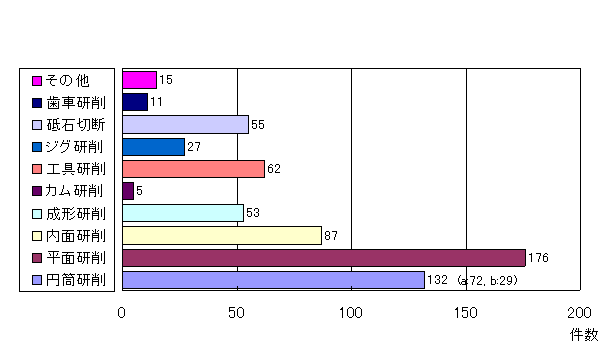 回答数623件で集計結果を図41に示す。研削加工は平面研削が多く、28%(176件)で、次いで円筒研削が21%(132件)、内面研削14%(87件)である。その他、工具研削10%(62件)、砥石切断9%(55件)であった。